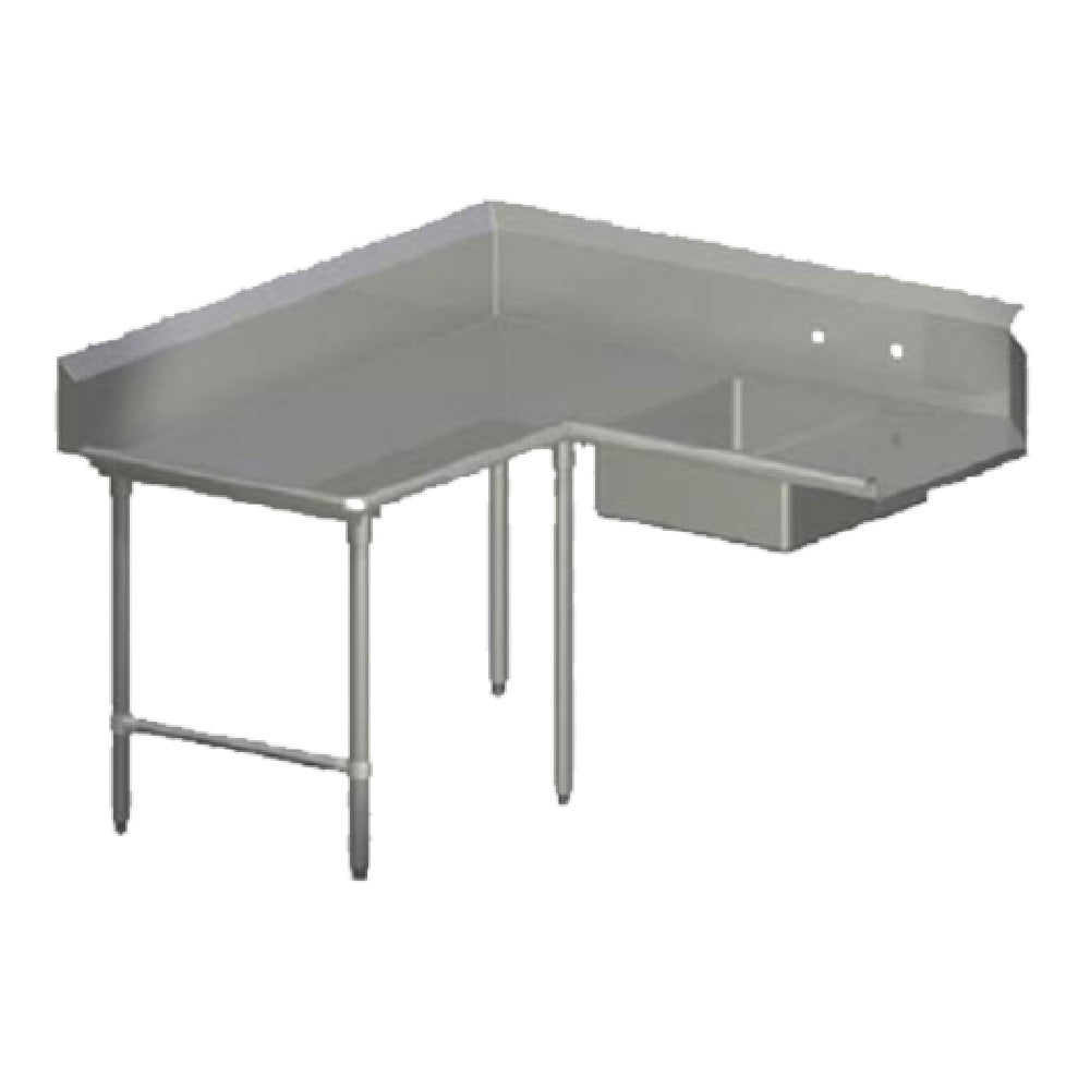 The John Boos SDT6-K6096SBK-L Pro-Bowl Soiled Dishtable is an expertly crafted piece of kitchen equipment designed for efficient workflow in commercial settings. With its unique corner design, it seamlessly integrates into a 60-inch machine-to-corner configuration, extending 96 inches from the corner to the end, providing a practical L-shaped layout for left-to-right operation. It features a 20-inch wide by 20-inch front-to-back by 8-inch deep pre-rinse sink bowl, ideal for handling soiled dishes. The robust 10-inch high boxed backsplash, complete with a 45-degree top and 2-inch return, enhances cleanliness by effectively containing splashes. The dishtable also includes a set of splash mount faucet holes with 8-inch centers. Its construction boasts a 2-1/4-inch high rolled edge and a top made from durable 16/300 stainless steel, ensuring longevity and resistance to corrosion. Supported by stainless steel legs and bracing, it also features adjustable bullet feet for stability on uneven surfaces. With an overall height of 44 inches, the dishtable is designed to meet NSF standards, affirming its suitability for maintaining high safety and hygiene standards in commercial kitchens. This versatile unit is ideal for various segments within the hospitality and food service industry, providing a reliable and efficient solution for dish handling and cleaning operations.