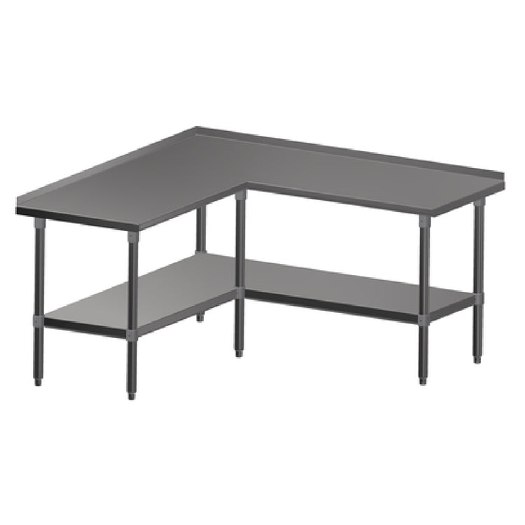 The John Boos ST4R1.5-L2460SSK Work Table is a meticulously engineered L-shaped work station designed for efficiency and durability, measuring 60"W x 60"D x 37-1/4"H overall with a 24" working depth. This work table features a premium 14/300 stainless steel top, highlighted by a 1-1/2" H rear up-turn to prevent items from falling off the back. Its Stallion Safety Edge front and 90-degree turndown sides add to the safety and practicality, reducing sharp edges and potential hazards in busy work environments. Supported by durable stainless steel legs, this table is built to withstand rigorous daily use and includes an adjustable undershelf for versatile storage solutions. The adjustable bullet feet ensure stability on uneven surfaces, making it suitable for a range of settings from commercial kitchens to industrial workshops. Its knock-down (KD) design enhances ease of assembly and transportation. Certified by NSF, it meets high standards for public health protection, ensuring it is a trustworthy choice for professional and industry use. The John Boos ST4R1.5-L2460SSK Work Table provides a reliable and spacious working area, perfectly suited for diverse market segments requiring robust and hygienic work surfaces.