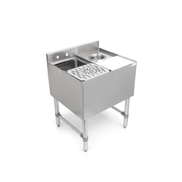 The John Boos UBMS-2124 Underbar Dump Sink Freestanding 24"W x 21"D x 32-1/2"H Overall Size is a versatile and durable solution ideal for various segments within the food service industry. This meticulously designed underbar dump sink features a single 10"W x 8" front-to-back x 6" deep fabricated sink bowl, providing ample space for efficient wastewater management. It includes a push-down rinser faucet, while the 5-3/4" diameter dipper well adds functionality, though please note the faucet is not included. The unit is complemented by an 11-1/2"W x 9-3/8"D removable poly cutting board, offering additional workspace flexibility. The 3"H backsplash and a set of removable splash mount faucet holes with 4" centers enhance its practicality. Designed with an 18/300 stainless steel construction, it ensures longevity and resilience, supported by stainless steel legs and side bracing. Adjustable stainless steel bullet feet contribute to its stability on uneven surfaces. The package includes a 9-1/2" x 6" x 5" deep perforated dump basket, facilitating efficient waste disposal. NSF certification underscores its compliance with health and safety standards. This underbar dump sink is an exemplary choice for bars and restaurants seeking a high-quality, functional, and compact sink solution.
