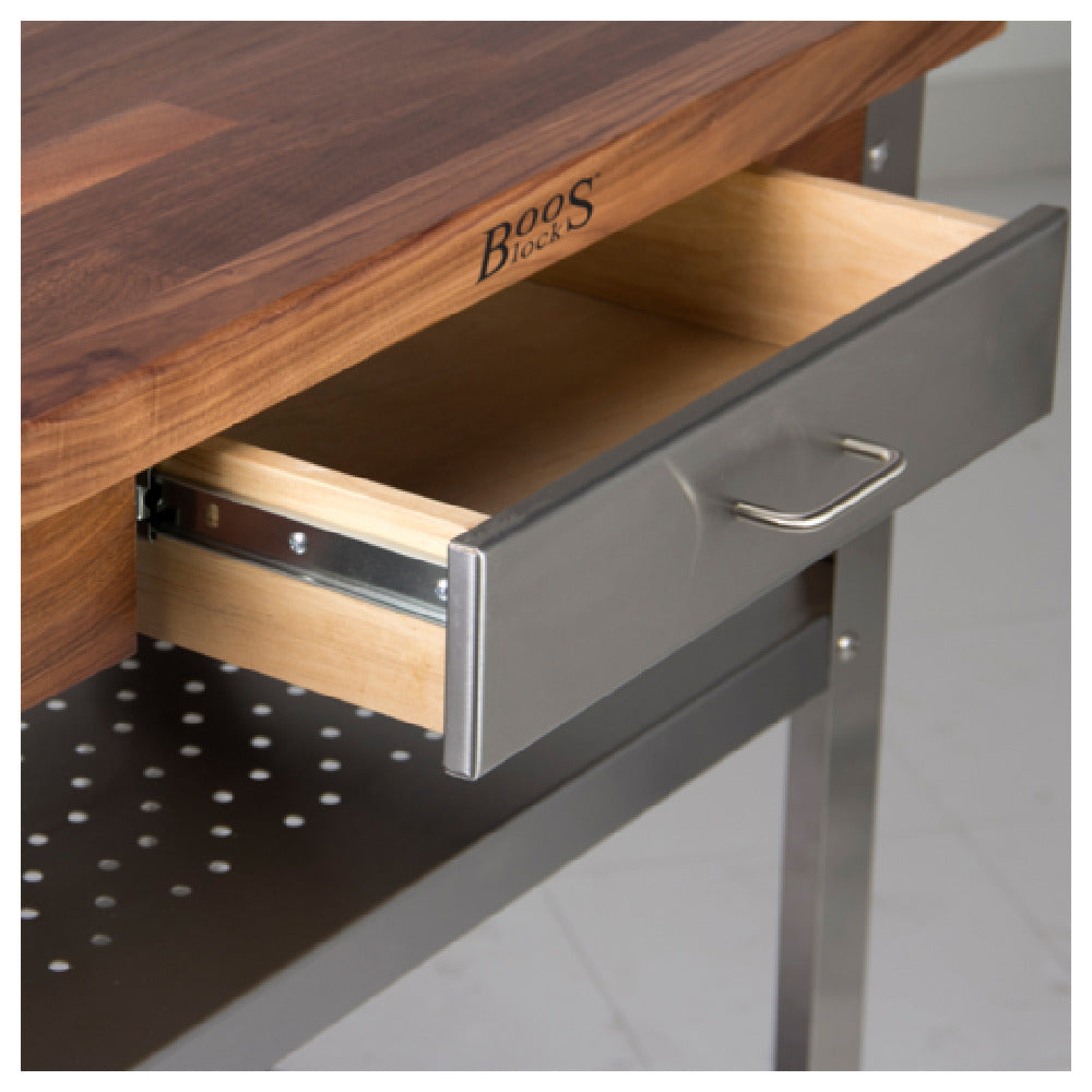 The John Boos WAL-CUCE30-ND Cucina Elegante Cart is a versatile kitchen essential designed with precision and craftsmanship. Measuring 30 inches in width, 20 inches in depth, and 35 inches in height, this cart offers ample working and storage space, ideal for both home kitchens and professional culinary environments. Its 1-1/2 inch thick edge grain top is crafted from American Black Walnut, known for its durability and aesthetic appeal, and finished with a Varnique finish for added protection and longevity. The cart's design includes two stainless steel shelves, providing practical storage solutions for various kitchen tools and ingredients. Its stainless steel legs add a sleek, modern touch, while the stainless steel towel bar enhances functionality. Equipped with 3-inch locking casters, the cart ensures mobility and stability as required. This unit is supplied as KD, meaning it is designed for knock-down packaging, facilitating easier transportation and assembly. The John Boos WAL-CUCE30-ND Cucina Elegante Cart combines elegance and utility, making it an indispensable addition for professional chefs, catering services, and home cooking enthusiasts looking for high-quality kitchen support furniture.