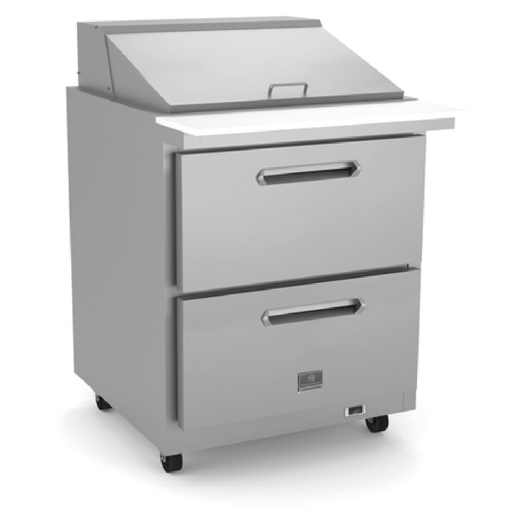 The Kelvinator KCHMT29.12.2D (738286) Mega Top Refrigerated Sandwich/Salad Prep Table is a versatile and efficient unit designed for commercial kitchens that require reliable cold storage and prep space. This one-section table measures 29 inches wide and features self-contained rear-mounted refrigeration, making it a compact yet powerful choice for foodservice operations. With a capacity of 7.0 cubic feet, it can accommodate twelve 1/6 GN pans, with adapter bars included, providing ample space for a variety of ingredients. The unit comes equipped with two drawers for organized storage and a full-depth cutting board, ensuring convenience during food preparation. The temperature range is maintained between +33 to +41°F, ideal for keeping ingredients fresh. Constructed with a durable 430 stainless steel worktop, the table also includes an insulated lid and a robust stainless steel interior, coupled with a galvanized, aluminum, and stainless steel exterior for longevity. Heavy-duty casters allow for easy mobility, and it uses R290 Hydrocarbon refrigerant, a more environmentally friendly option. The Kelvinator KCHMT29.12.2D operates on 115v/60/1-ph, with a power usage of 0.5kW and 5 amps, and is fitted with a NEMA 5-15P plug. Additionally, it is cETLus and ETL-Sanitation certified, meeting rigorous safety and sanitation standards.