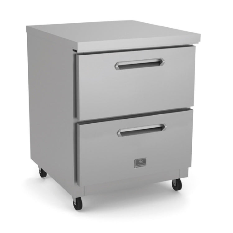 Kelvinator Commercial, KCHUC27.2DR-32, (738337) 2- drawer undercounter refrigerator, reach-in, one section, 32 inch tall, 27 inch wide, with exterior back panel, exterior bottom panel, and exterior top panel in galvanized steel, exterior side panel in 430 stainless steel, interior back, top and bottom panels in 304 stainless steel. Self-contained rear mounted refrigeration. Fin & tube condenser to improve the performances in high temperature environments. Automatic Defrost Cooling System and temperature control. Vinyl heavy duty adjustable, easy to handle and clean shelves. External temperature display. R600a gas in refrigeration circuit, 1/10 HP, 115v/60/1-ph, 1.5 amps, NEMA 5-15P, ETL Safety and Sanitation certified. 3/5 Years warranty.