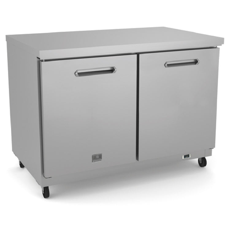 The Kelvinator KCHUC48R (738264) Undercounter Refrigerator Reach-in Two-section is designed specifically for commercial environments that require efficient and reliable refrigeration. With dimensions of 48"W, this unit is equipped with self-contained rear-mounted refrigeration, making it suitable for tight spaces where efficiency and accessibility are paramount. It features two solid hinged doors, each with a vinyl-coated steel shelf, providing ample storage for various food items. The refrigeration system maintains a temperature range of +33/+41°F, ensuring optimal conditions for perishable goods. The interior is constructed from durable stainless steel, while the exterior incorporates galvanized, aluminum, and stainless steel elements for enhanced longevity and resistance to wear. Mounted on casters, this refrigerator offers mobility and ease of cleaning, a crucial aspect for busy kitchens. Utilizing R600a Hydrocarbon refrigerant and powered by a 1/5 HP motor, this model is also energy-efficient, consuming only 0.3kW with a current draw of 3 amps and operates on a 115v/60/1-ph electrical supply, connected via NEMA 5-15P plug. Its compliance with cETLus and ETL-Sanitation standards, along with ENERGY STAR® certification, highlights its commitment to safety and environmental responsibility, making it an excellent choice for diverse food service operations.
