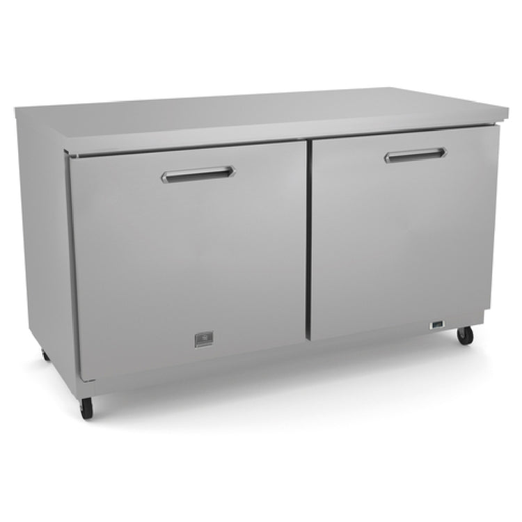 The Kelvinator KCHUC60R (738291) Undercounter Refrigerator Reach-in Two-section is a versatile solution for commercial kitchens seeking efficient refrigeration. This model boasts a generous 60-inch width, offering ample storage space while maintaining a compact footprint suitable for undercounter placement. Featuring self-contained rear-mounted refrigeration, it ensures consistent cooling performance across its two-section design. Each of the two solid hinged doors is equipped with a vinyl-coated steel shelf, providing sturdy and reliable storage for various food items. The interior is crafted from stainless steel, ensuring durability and ease of cleaning, while the exterior combines galvanized, aluminum, and stainless steel materials for a robust yet sleek finish. The unit operates within a temperature range of +33 to +41°F, ideal for preserving perishable goods. Mounted on casters, it offers mobility and ease of placement in a busy kitchen environment. Utilizing R600a Hydrocarbon refrigerant and a 1/6 HP compressor, this refrigerator is both eco-friendly and energy-efficient, as evidenced by its ENERGY STAR certification. With a power requirement of 115 volts, 0.3kW, and 3 amps, it features a NEMA 5-15P plug and meets cETLus and ETL-Sanitation standards, making it a reliable choice for various commercial settings within the foodservice industry.