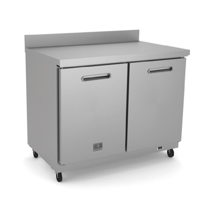 Kelvinator Commercial, KCHUCWT36R, (738338) 2-solid hinged door counter top refrigerator, 35.5 inch tall worktop with backsplash, reach-in, two-section, 36 inch wide, with exterior back panel, exterior bottom panel, and exterior top panel in galvanized steel, exterior side panel in 430 stainless steel, interior back, top and bottom panels in 304 stainless steel. Self-contained rear mounted refrigeration. Fin & tube condenser to improve the performances in high temperature environments. Automatic Defrost Cooling System and temperature control. Vinyl heavy duty adjustable, easy to handle and clean shelves. External temperature display. R600a gas in refrigeration circuit, 1/10 HP, 115v/60/1-ph, 2.0 amps, NEMA 5-15P. ETL Safety and Sanitation certified. 3/5 Years warranty.