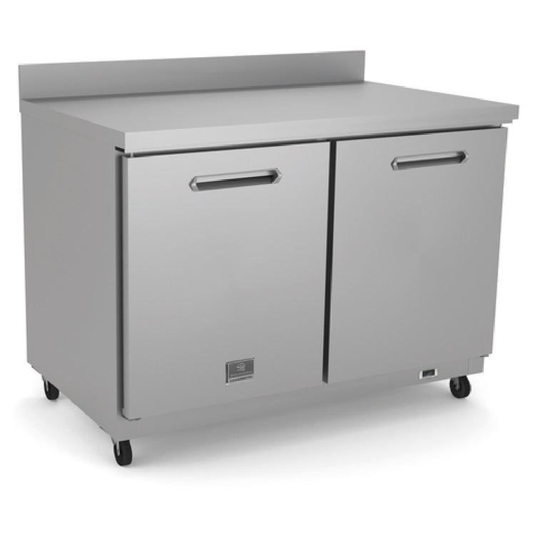 The Kelvinator KCHUCWT48R (738300) Undercounter Refrigerator Reach-in Two-section is a robust solution designed for commercial spaces requiring reliable refrigeration. This unit features a two-section reach-in design with dimensions of 48 inches in width, providing ample storage for various food products. It operates within a temperature range of +33/+41°F, ensuring that perishables are kept at optimal conditions. The refrigerator includes two solid hinged doors, each accompanied by a vinyl-coated steel shelf, enhancing its storage capacity and versatility. The self-contained rear mounted refrigeration utilizes R600a Hydrocarbon refrigerant, making it a more environmentally friendly option. Constructed with a 430 stainless steel worktop, complete with a backsplash, it offers durability and ease of cleaning. The interior is crafted from stainless steel, while the exterior combines galvanized, aluminum, and stainless steel materials for added longevity. Equipped with casters, this refrigerator can be easily maneuvered within a workspace. It operates with a 1/6 HP compressor at 115v/60/1-ph, consuming 0.3kW and drawing 3 amps, adhering to NEMA 5-15P standards. Both cETLus and ETL-Sanitation certified, the Kelvinator KCHUCWT48R is engineered to meet rigorous safety and sanitation standards, making it an excellent choice for commercial kitchens and food service establishments.