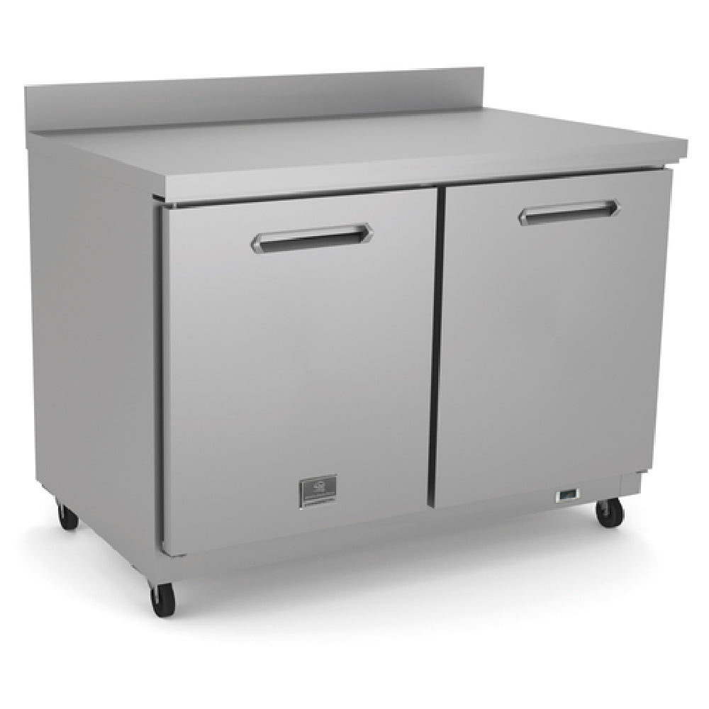The Kelvinator KCHUCWT60R (738301) Undercounter Refrigerator Reach-in Two-section is a highly efficient refrigeration unit designed for commercial environments that require reliable undercounter storage. With dimensions of 60 inches in width, this refrigerator features a self-contained rear-mounted refrigeration system, providing a temperature range between +33 and +41°F. The unit is equipped with two solid hinged doors, each containing one vinyl-coated steel shelf for optimized storage and organization. The refrigerator's 430 stainless steel worktop includes a backsplash, enhancing durability and ease of cleaning. Constructed with a robust combination of stainless steel, galvanized steel, and aluminum, the Kelvinator KCHUCWT60R ensures long-lasting performance and resilience in demanding settings. Mobility is facilitated by casters, allowing for convenient placement and repositioning within any commercial kitchen. This unit uses R600a Hydrocarbon refrigerant, featuring a 1/6 HP compressor, and operates on a 115v/60/1-ph electrical connection, consuming 0.3kW and 3 amps. The NEMA 5-15P plug ensures compatibility with standard outlets. Both cETLus and ETL-Sanitation certifications attest to the product’s adherence to safety and sanitation standards. This undercounter refrigerator is a versatile and practical solution for various sectors of the food industry that require dependable refrigeration with space-efficient design.
