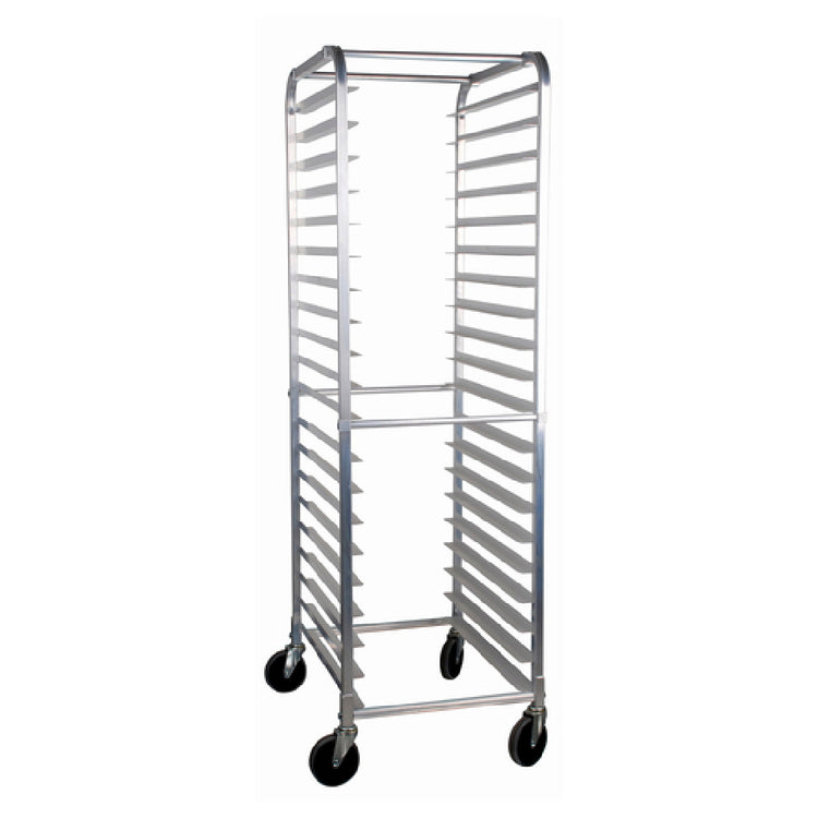 Klinger's Trading, PANRACK20, Sheet Pan Rack, mobile, full height, end loading, open sides, accommodates (20) 18" x 26" pans, slides on 3" centers, 18 gauge aluminum construction, (4) 5" polyurethane casters, NSF, KD