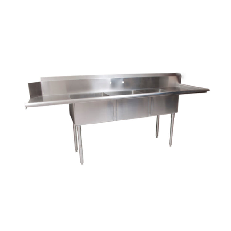 Klinger's Trading, SDT32020DL, Soiled Dishtable, 30-3/8"W x 100"D x 44"H, straight design, 18/304 stainless steel top with backsplash, (3) 20" x 20" x 12" bowls, (2) faucet holes, stainless steel legs & crossrails, NSF