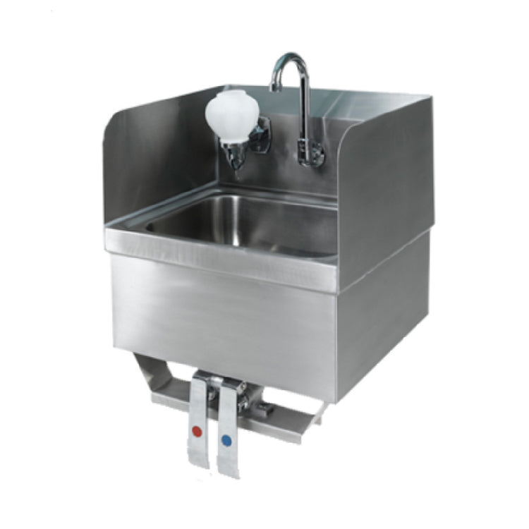 Klinger's Trading, SPKNEE-SPKVHS-1000, Hand Sink, wall mount with knee pedal valves, 13-1/2" wide x 9-3/4" front to back x 4-1/2" deep bowl, stainless steel construction, side splashes on left & right, splash mount gooseneck faucet with wrist handles, soap dispenser, basket drain, NSF