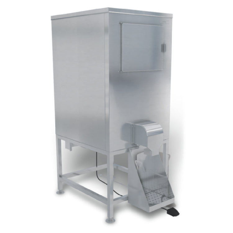 The Kloppenberg DISP-500 Ice Storage Dispenser is engineered to accommodate a substantial ice capacity of 647 pounds, making it a versatile solution for various sectors that require efficient ice storage and dispensing. This unit features a single poly chute, which streamlines the dispensing process while minimizing potential clogging issues. With a minimum door clearance of 30 inches, the dispenser is designed for seamless integration into diverse environments. The stainless steel agitator and auger ensure durability and reliability, enhancing the longevity of the dispenser's performance. Foot pedal activation provides a hands-free operation option, promoting hygiene and convenience. The dispenser also includes a stainless steel adjustable bag shelf, catering to varying storage needs. Safety is prioritized with an access door equipped with a safety interlock switch, ensuring secure usage. The construction includes a stainless steel front, sides, and bottom, paired with a galvanized back, offering a robust and resilient build. Supported by a 1-1/2 inch square tube steel base, the unit's stability is assured. Powered by a 1/2 HP motor, the DISP-500 is NSF certified and proudly made in the USA, reflecting its compliance with stringent industry standards and quality benchmarks. This ice dispenser is an exceptional choice for businesses seeking a reliable and efficient ice storage solution.