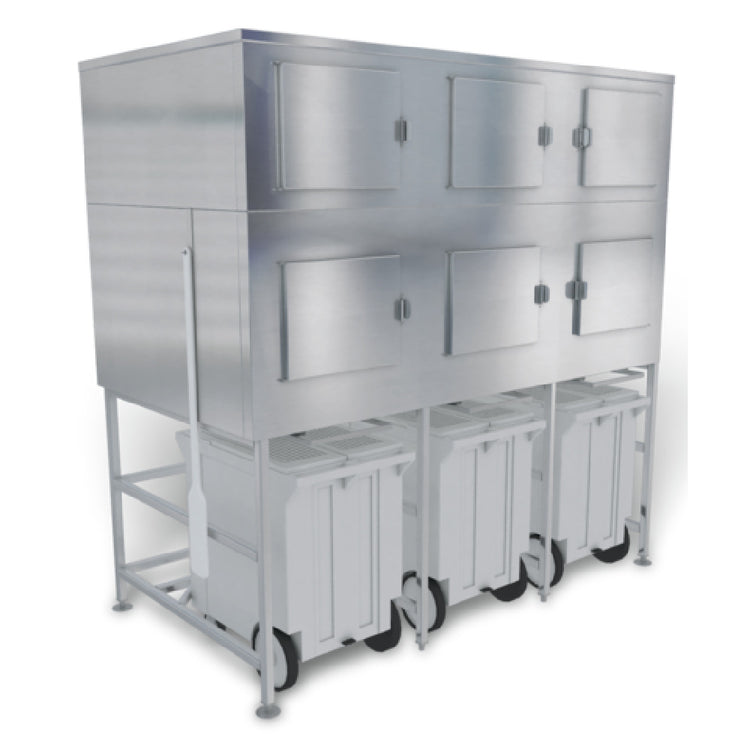 The Kloppenberg SPS-3-SL Shuttle Plus Storage® is an advanced storage solution with a substantial capacity of 3400 pounds, designed to meet the demanding needs of various industries. This product boasts a minimum door clearance of 36 inches, facilitating easy access and integration into diverse environments. It features a durable stainless steel exterior and interior, ensuring longevity and resistance to wear and tear. The unit is equipped with three guillotine ice shut-offs and six shovel doors, offering efficient and versatile access to stored materials. Its robust stainless steel tubular base includes a cart drain center rear, enhancing its practicality in industrial settings. The SPS-3-SL comes standard with three poly carts, providing additional utility and flexibility. Certified by NSF and proudly made in the USA, this product guarantees adherence to high quality and safety standards. It effectively combines large-scale capacity with meticulous design, making it an ideal choice for sectors that demand reliable and heavy-duty storage solutions.