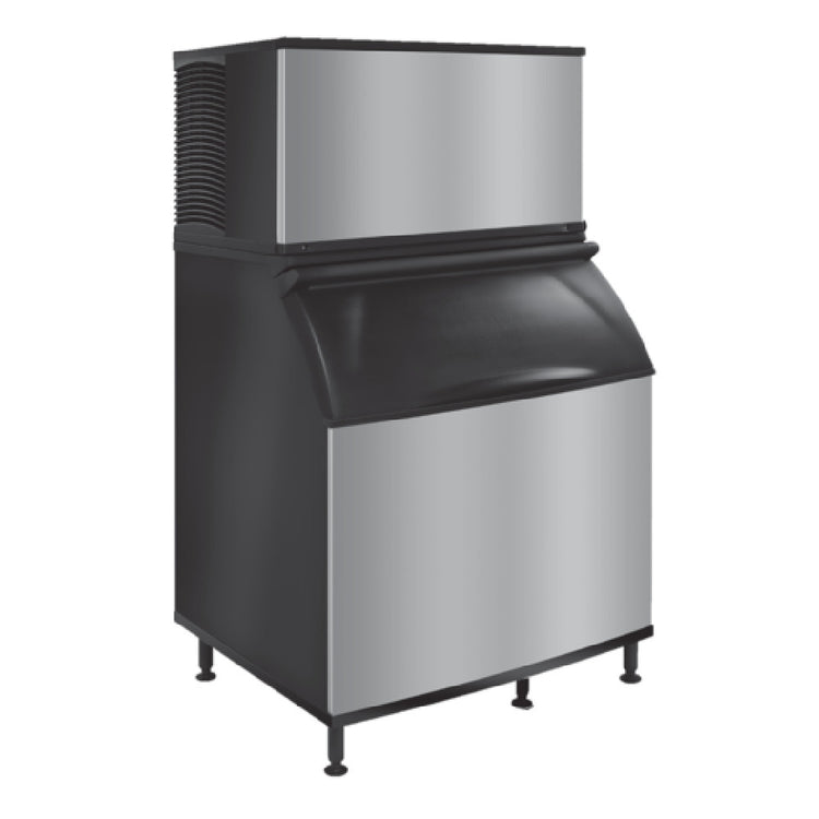 The Koolaire KDT1700W Ice Kube Machine Cube Style Water-cooled is a high-capacity ice production solution designed for commercial applications requiring significant ice output. Measuring 48 inches in width, this robust machine can produce up to 1600 pounds of ice per 24 hours under optimal conditions of 70°F ambient and 50°F water temperatures, with a certified production of 1400 pounds in 90°F ambient and 70°F water conditions according to AHRI standards. The machine features a self-contained water-cooled condenser, which is beneficial for environments where air conditioning and ventilation systems can be overtaxed by air-cooled alternatives. The Koolaire KDT1700W is designed with one-touch cleaning, enhancing its operational convenience and maintaining hygiene with its Alpha San anti-microbial protection. The stainless-like finish is smudge and fingerprint resistant, ensuring it maintains a clean, professional appearance in any setting. It produces full-dice size ice cubes and uses R410a refrigerant, aligning with modern environmental standards. Certified by NSF, cULus, and CE, it meets rigorous safety and performance criteria, making it suitable for restaurants, bars, and other food service establishments that demand reliability and efficiency in ice production. This model replaces the KD-1350W, reflecting its enhanced capabilities and updated design features.
