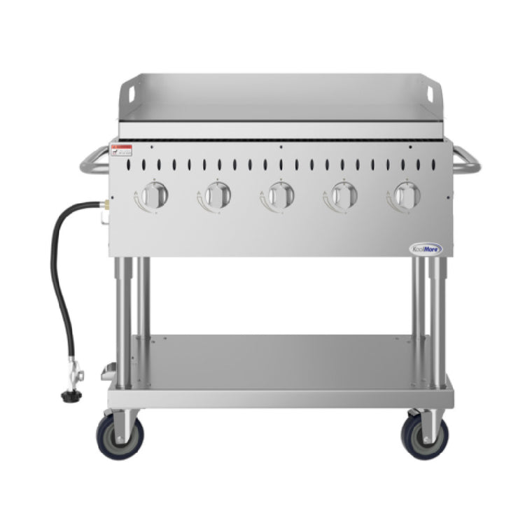 Koolmore, CGKIT3-36G, Commercial Outdoor Grill, 35-4/5"W x 23-1/5"D x 40-4/5"H, (5) burner, 16,000 BTU each, propane gas, with heavy-duty griddle plate, (2) heavy-duty grates, connection hose, side handle, quick start-up, Piezo ignition system, sturdy casters, 13-ga 304 stainless steel construction, ETL (CGKIT3-36G), Shipping Dimension (40.8" H)