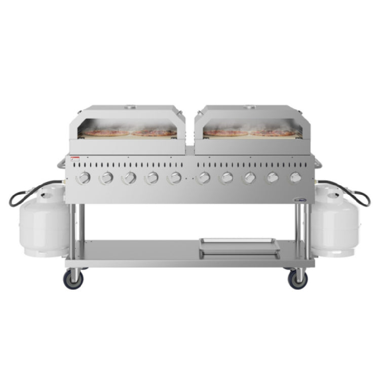 Koolmore, CGKIT7-P36P36, Commercial Outdoor Grill, 72-2/5"W x 23-1/5"D x 46-1/5"H, (10) burner, 16,000 BTU each, propane gas, (2) 36" pizza oven grill, fits two pizza stones, temperature control, (4) heavy-duty grates, (2) connection hoses, side handle, quick start-up, Piezo ignition system, dual tank capacity, sturdy casters, 13-ga 304 stainless steel construction, ETL (CGKIT7-P30P30), Shipping Dimension (46.2" H)