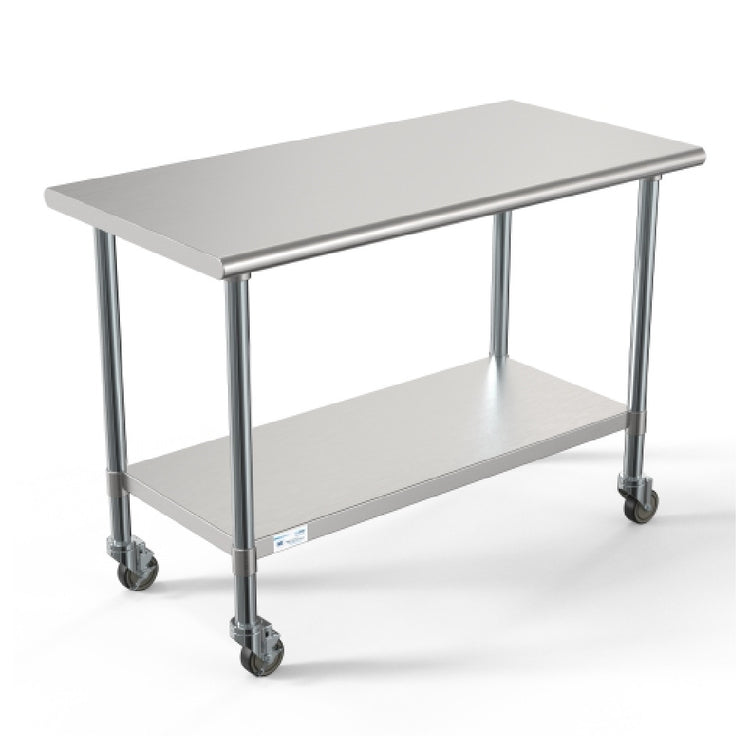The Koolmore CT2448-18C Work Table 48"W x 24"D x 34"H with Undershelf is an exceptional piece of equipment designed for professional kitchens, offering both functionality and durability. This work table is constructed from 18/304 stainless steel, ensuring a robust and corrosion-resistant workspace that can withstand the rigorous demands of various culinary settings. The inclusion of an undershelf provides additional storage space, maximizing efficiency within compact kitchen environments. Equipped with 5" lockable rolling caster wheels, the table offers convenient mobility and stability, allowing it to be easily repositioned as needed while ensuring it remains securely in place during use. The Koolmore CT2448-18C is NSF certified, highlighting its adherence to public health and safety standards. This work table's dimensions - 48 inches in width, 24 inches in depth, and 34 inches in height - make it versatile enough to accommodate a variety of tasks, from food preparation to equipment support, in different segment markets within the food service industry. Whether used in restaurants, bakeries, or catering services, its practical design and reliable construction make it an indispensable asset in any professional kitchen setup.
