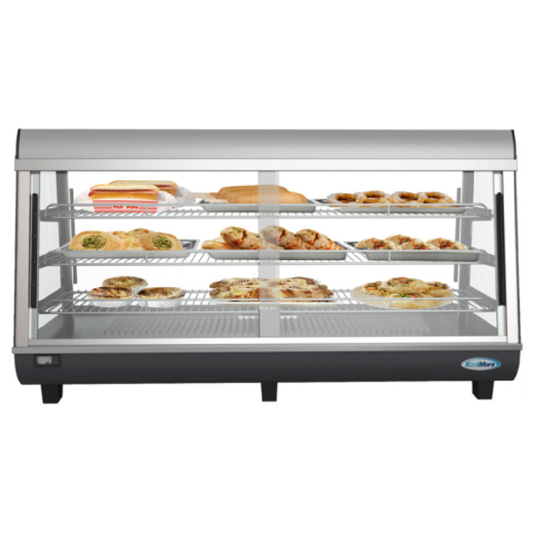 The Koolmore HDC-6C Display Warmer Countertop 48"W is a versatile and efficient solution for showcasing hot food items across various market segments, including retail food chains, cafes, and catering services. With a spacious 6.5 cu. ft. capacity and three shelves, this display warmer is designed for self-service operations, enhancing customer interaction with its easy-access sliding front door. It features a thermostatic temperature control system that ranges from 86 to 194°F, ensuring precise heat management to keep food at optimal serving temperatures. The unit's curved front glass not only provides an elegant display but also maximizes visibility, enticing customers with a clear view of the contents. The LED lighting enhances this visual appeal by illuminating the displayed items from within. Constructed with four-sided double-tempered glass and a stainless steel base, this display warmer is both sturdy and stylish, ensuring durability and ease of maintenance. Its countertop design allows for convenient placement in various settings, making it a valuable addition to any operation looking to maintain both product quality and aesthetic presentation. The Koolmore HDC-6C combines functionality with design, catering to the needs of businesses aiming for efficiency and customer satisfaction in their hot food display areas.