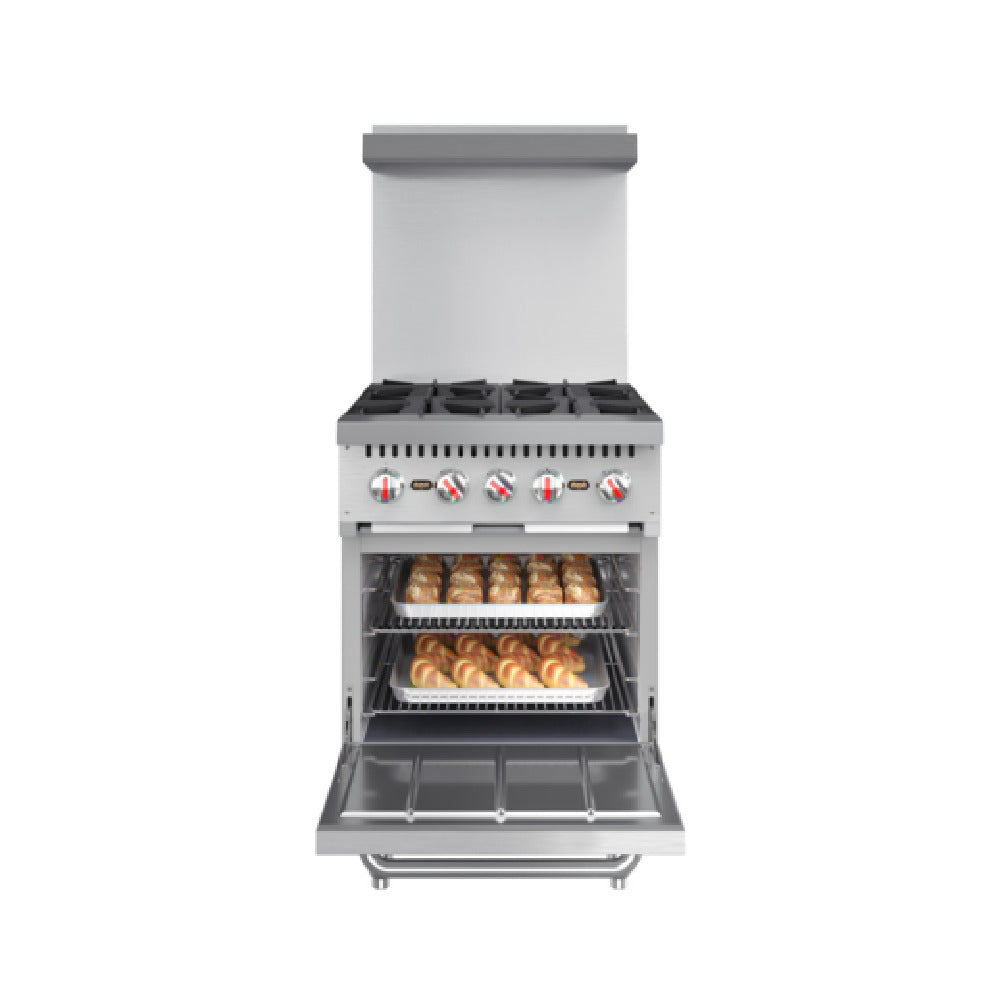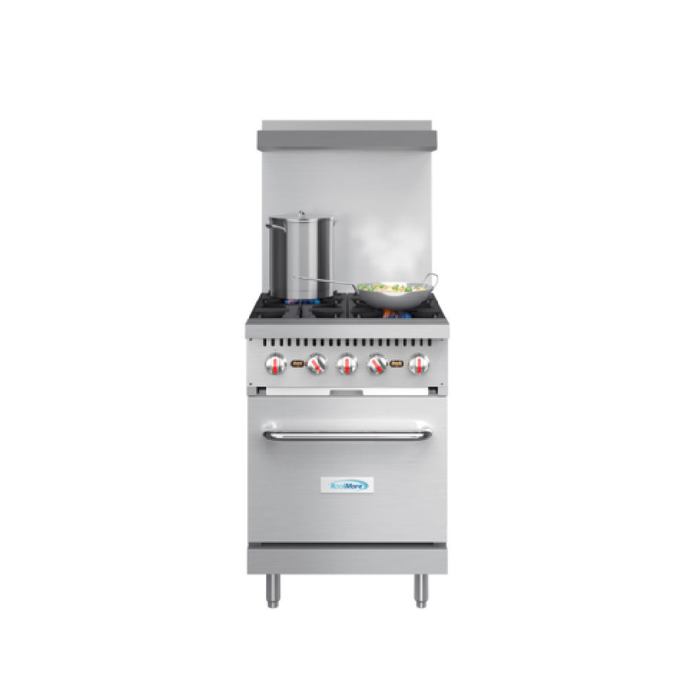 The Koolmore KM-CR24-NG Commercial Range Natural Gas 24" W is a versatile and efficient kitchen appliance designed for commercial culinary environments. This unit features four powerful burners, providing ample cooking space for diverse menu items, and is fueled by natural gas, ensuring consistent heat and energy efficiency. The inclusion of an integrated oven expands its functionality, allowing for both stovetop and baking needs in one compact footprint. Constructed with high-quality stainless steel, the Koolmore KM-CR24-NG boasts durability and easy maintenance, making it suitable for high-demand settings such as restaurants, catering businesses, and food service operations. Its 24-inch width is ideal for kitchens that require a space-saving solution without compromising on capability or performance. This commercial range is tailored to meet the demands of professional kitchens, offering reliable performance, robust construction, and versatile cooking capabilities. The product's technical specifications highlight its suitability for a wide range of culinary applications, ensuring that it meets the needs of different market segments within the food industry. Whether used in bustling restaurant environments or catering services, the Koolmore KM-CR24-NG Commercial Range stands out for its efficiency and practicality, making it a valuable asset for any commercial kitchen.