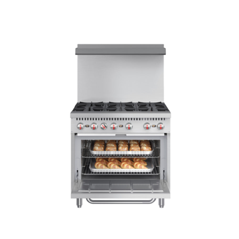The Koolmore KM-CR36-LP Commercial Range is a robust culinary appliance designed for high-demand kitchens, boasting a width of 36 inches and running on liquid propane. This range is equipped with six powerful burners, making it ideal for preparing multiple dishes simultaneously, a feature highly valued in busy commercial settings such as restaurants and catering services. The inclusion of an oven enhances its versatility, allowing chefs to execute a wide array of cooking methods from simmering to roasting. Constructed with stainless steel, this range not only ensures durability and longevity but also provides a sleek, professional appearance that complements any commercial kitchen environment. Its substantial cooking capabilities and sturdy build make it a valuable asset for culinary professionals who require reliability and efficiency. With its combination of multiple burners and a spacious oven, the Koolmore KM-CR36-LP is particularly suited for large-scale food preparation, contributing to operational efficiency and helping meet the demands of a fast-paced culinary setting. This commercial range's design caters to the distinct needs of the foodservice industry, providing a reliable tool for chefs aiming to deliver consistent, high-quality results.