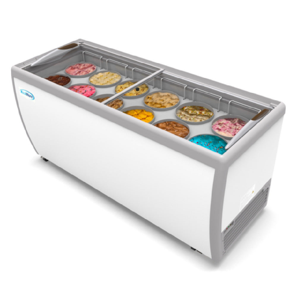 The Koolmore KM-ICD-71SD Ice Cream Dipping Display Cabinet is a specialized unit designed to meet various industry needs with a width of 70 inches and a generous capacity of 20 cubic feet. This cabinet can accommodate up to 12 tubs of ice cream, making it an excellent choice for ice cream parlors, cafes, and other food service venues requiring efficient product display and storage. The top sliding glass door is a key feature, providing easy access and visibility to the selection of flavors while maintaining optimal temperature control. Interior LED lighting enhances product presentation, ensuring vibrant and appealing displays. Lockable caster wheels offer mobility and stability, allowing for easy repositioning and secure placement. The Koolmore KM-ICD-71SD is ETL sanitation certified, ensuring compliance with hygiene and safety standards critical for food handling environments. This combination of features makes the Koolmore KM-ICD-71SD an invaluable asset in any establishment looking to efficiently serve and showcase a variety of ice cream products.