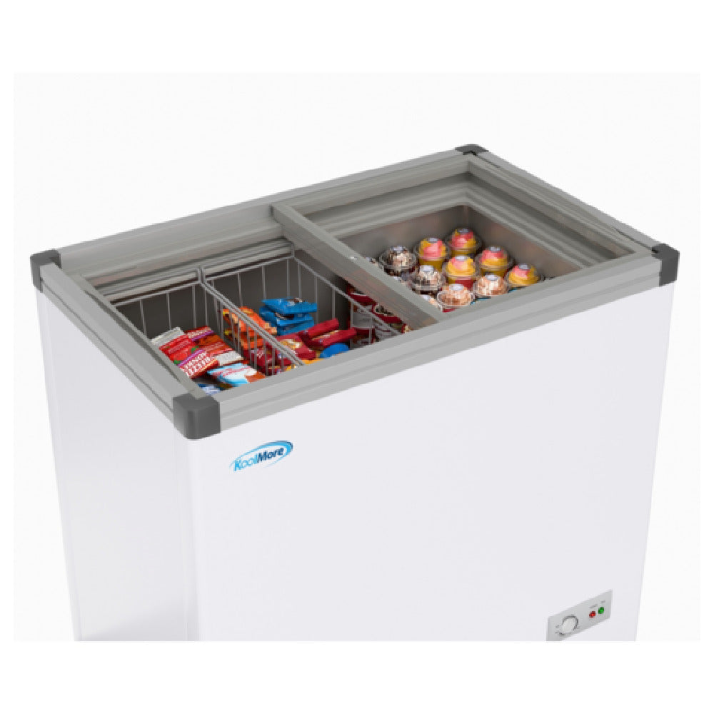 Koolmore, KM-ICD-7C, Ice Cream Dipping Display Cabinet, 33.94"W, 7 cu. ft. capacity, with single wire basket, top sliding tempered glass doors, interior LED lighting, lockable caster wheels, painted steel exterior and an embossed aluminum interior, NEMA 5-15P plug, 0.93 HP compressor, ETL, ETL-Sanitation, Shipping Dimension (23.9" W x 36.26" D x 34.7" H)