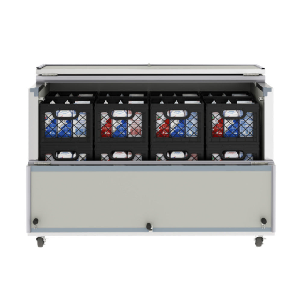 Koolmore, KM-MC58-HDC, Milk Cooler, 16-crate capacity (13" dia., x 11"H), 58"W, two vertical swing glass doors, interior LED lighting, 4" polypropylene casters, build with stainless-steel construction with a painted steel exterior and a stainless-steel 304 interior, ETL, ETL-Sanitation, Shipping Dimension (31.6" W x 59" D x 46" H)