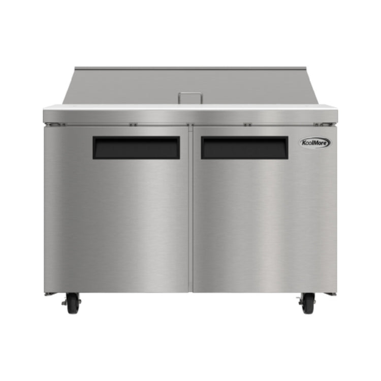 Koolmore, KM-PTR46-2D, Salad and Sandwich Prep Table, 47"W, 14 cu ft., (2) doors, rear-mounted compressor, (2) adjustable polymer-coated steel shelf that holds up to 88 lbs., 33°F to 40°F temperature range, (12) 1/6 GN pans included, 46.69” removeable polyethylene cutting board, front digital control panel with LED display, insulated pan lid, corrosion-resistant stainless steel with cyclopentane insulation, (4) swivel casters, R-290 refrigerant