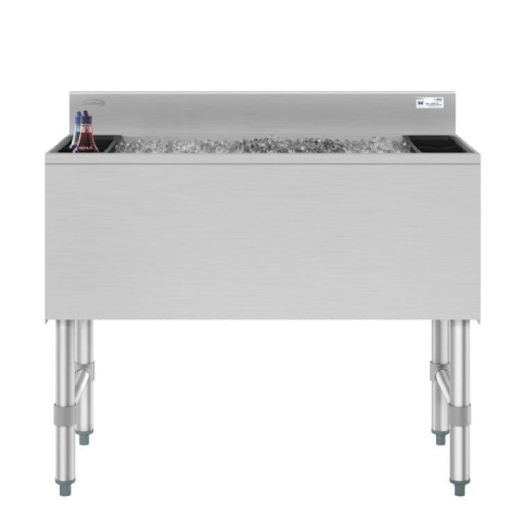 Koolmore, KM-UIB-1836, Commercial Underbar Ice Bin, 36"W, 119 lbs. ice storage capacity, stainless steel construction, insulated sliding cover, 1/2-inch bottom drain connection, foamed-in-place polyurethane insulation, adjustable plastic bullet feet, 3-inch backsplash, includes 2 bottle holders (3 bottles each), galvanized steel legs, NSF, Shipping Dimension (22.4" W x 40" D x 23.3" H)