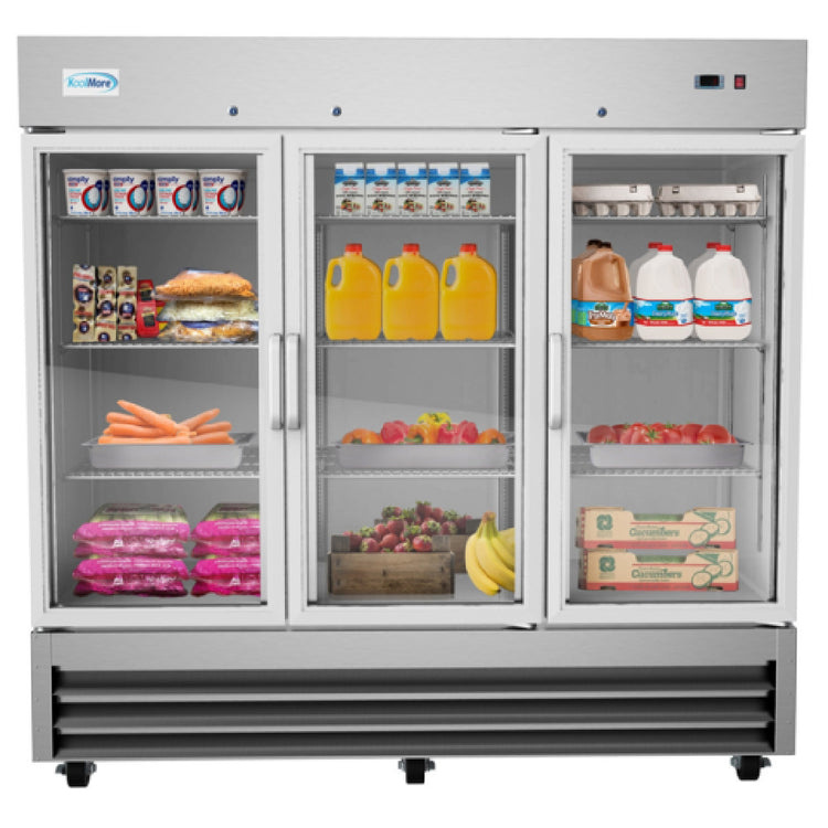 The Koolmore RIR-3D-GD Refrigerator Reach In Three-section is designed to meet the demanding needs of commercial kitchens and food service industries. With an 80-9/10" width and a 72 cubic feet storage capacity, this refrigerator is built to accommodate large quantities of perishable goods efficiently. It features three glass doors equipped with locks, ensuring both visibility and security of stored items. The bottom mount self-contained refrigeration system, utilizing R290 Hydrocarbon refrigerant, offers an eco-friendly cooling solution that operates with a 3/4 horsepower compressor and a 9.1-amp electrical draw on a 115v/60/1-ph power supply, using a NEMA 5-15P plug. This model includes nine adjustable shelves that provide customizable storage options, while auto defrost and digital temperature controls with displays maintain optimal food safety standards. Interior lighting enhances visibility, and casters facilitate easy mobility within your workspace. Constructed with durable stainless steel for both interior and exterior, this refrigerator ensures long-lasting performance and easy cleaning. Certified by cETLus and ETL-Sanitation, the Koolmore RIR-3D-GD is a practical and reliable choice for restaurants, catering businesses, and institutional kitchens seeking a high-capacity refrigeration solution. Its combination of advanced features and robust design makes it a valuable asset for any professional kitchen environment.