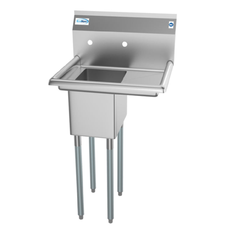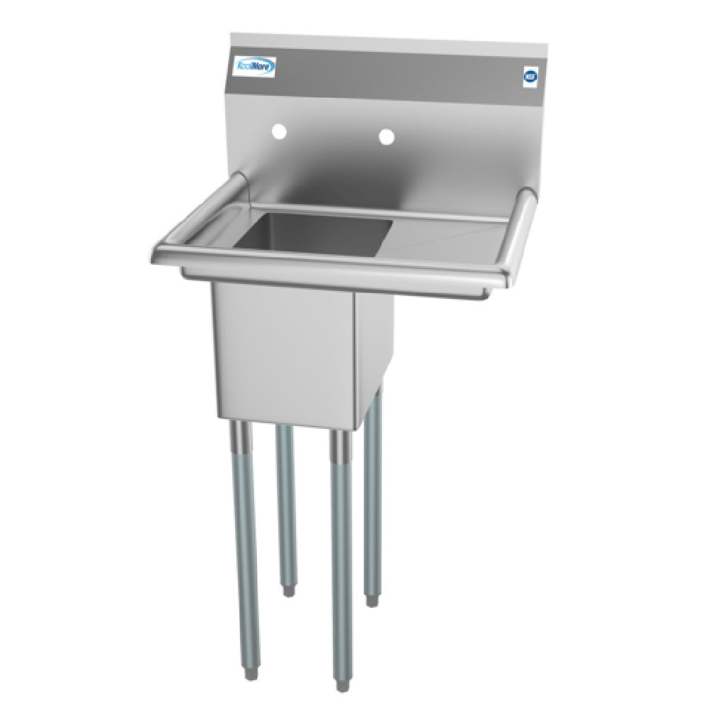 The Koolmore SA101410-10R3 Sink is a versatile and practical solution for various commercial kitchen environments, offering a 1-compartment design with a 23-inch width, 20-inch depth, and 44-1/2-inch height overall size. This sink features a 10-inch wide, 14-inch front-to-back, and 10-inch deep compartment for efficient washing and rinsing tasks. It includes a 10-inch right side drainboard, providing additional space for drying dishes or preparing food. The integrated backsplash helps protect walls from water damage, while the set of splash mount faucet holes with 8-inch centers accommodates a range of faucet styles. Equipped with a 3-1/2-inch basket drain with strainer, the sink ensures efficient drainage and debris capture. Crafted from high-quality 18/304 stainless steel, the Koolmore SA101410-10R3 is built for durability and resistance to corrosion in demanding kitchen settings. Its galvanized steel legs and adjustable 1-1/2-inch bullet feet allow for stable installation and height customization, ensuring a perfect fit in any workspace. NSF certification guarantees compliance with public health and safety standards, making this sink a reliable choice for food service operations, including restaurants, cafes, and catering services, where hygiene and functionality are paramount.