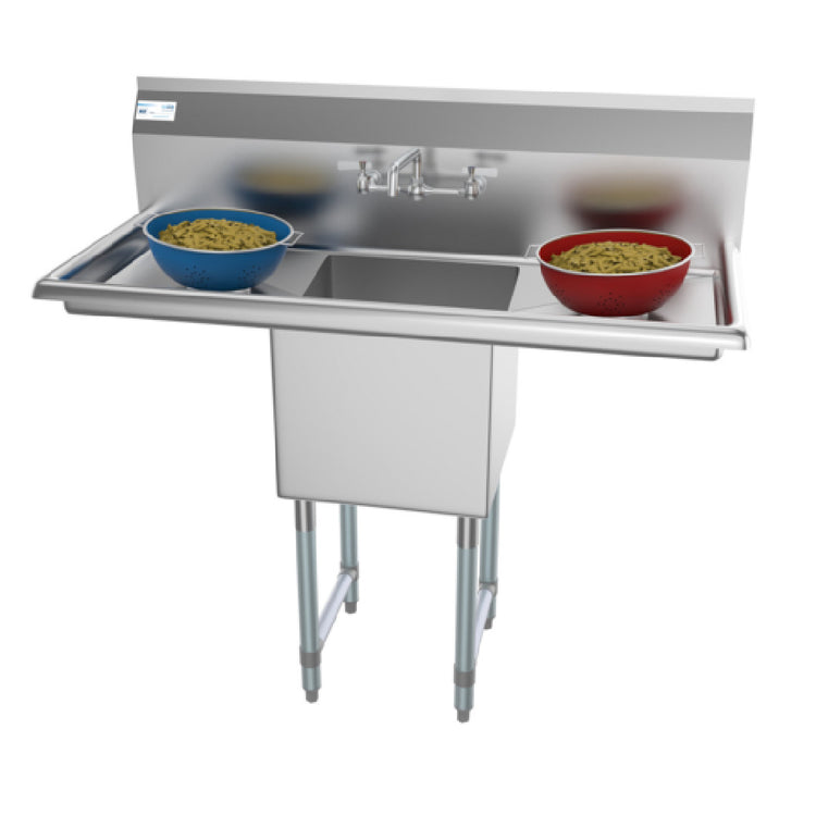 The Koolmore SA151512-15B3FA sink is a high-quality 1-compartment unit designed for professional kitchens and food service operations. With an overall size of 45 inches wide by 21 inches deep and 44-1/2 inches high, it offers ample space for various washing tasks. The sink features a single, 15-inch wide, 15-inch front-to-back, and 12-inch deep compartment, providing sufficient room for cleaning large pots and pans. Additionally, it includes two 15-inch left and right drainboards, enhancing efficiency and convenience in busy kitchen environments. The integrated backsplash and 8-inch center faucet ensure a clean and controlled workflow, while the 3-1/2-inch basket drain comes with a strainer to prevent clogs. Constructed from 18/304 stainless steel, the sink ensures durability and resistance to corrosion, making it suitable for heavy-duty use. The galvanized steel legs with adjustable 1-1/2-inch bullet feet allow for stable positioning on uneven surfaces. The Koolmore SA151512-15B3FA sink is NSF certified, ensuring it meets strict public health and safety standards, making it an ideal choice for restaurants, cafes, and other food service establishments where reliability and hygiene are paramount.
