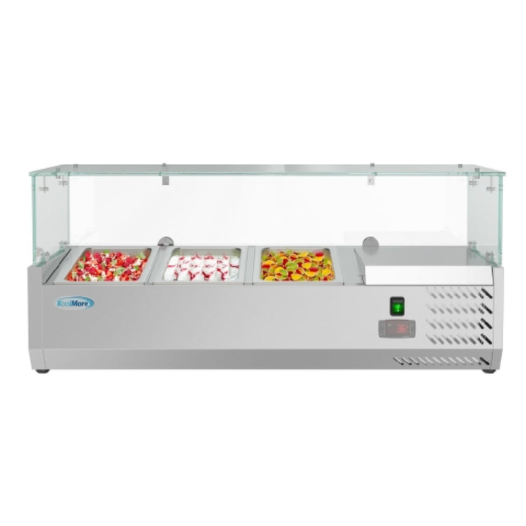 The Koolmore SCDC-3P-SSL Refrigerated Countertop Prep Unit is an expertly engineered piece of equipment that is 39-9/10 inches wide and accommodates a (3) 1/3 pan capacity, making it an efficient choice for commercial kitchens aiming for space-efficient food preparation and presentation. The unit features a double tempered glass food guard, providing a clear view of ingredients while ensuring food safety and hygiene. Its stainless steel interior and exterior offer durability and easy cleaning, making it ideal for high-volume usage in restaurants, cafes, and catering services. The unit is equipped with digital temperature controls and display, allowing precise regulation of cooling conditions. The side-mounted self-contained refrigeration system, employing a direct cooling method, ensures consistent temperature maintenance, while the auto defrost function minimizes manual maintenance efforts. Operating with R-600a refrigerant and powered by a 1/10 HP motor, it requires a 115v/60/1-ph electrical connection, supported by a NEMA 5-15P plug. Compliance with cETLus and ETL-Sanitation standards underscores its commitment to safety and sanitation. This prep unit is designed to enhance operational efficiency, making it a versatile addition to various food service industry segments seeking reliable refrigerated countertop solutions.