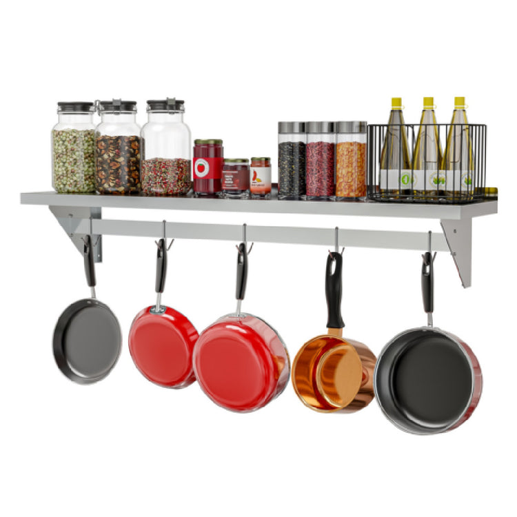 The Koolmore WMPS-1260 Wall Shelf With Pot Rack 60"W X 12"D (5) Removable Hooks is a versatile and essential component for commercial kitchens and home cooking spaces, designed to maximize storage efficiency and organization. This 60 inches wide and 12 inches deep wall shelf is constructed from 18-gauge heavy-duty stainless steel, ensuring durability and longevity even under the demands of a busy kitchen environment. The inclusion of five removable hooks provides flexible hanging options for pots, pans, and other kitchen utensils, allowing for easy access and improved workspace efficiency. The Koolmore WMPS-1260 is NSF certified, which highlights its adherence to strict public health and safety standards, making it a reliable choice for professional culinary settings. The package includes all necessary mounting hardware, facilitating straightforward installation and immediate usability. This wall shelf and pot rack combination is a practical addition to any kitchen, offering substantial storage capabilities while maintaining a sleek, professional appearance. The robust stainless steel construction and thoughtful design elements make it a valuable asset, catering to the organizational needs of various segments within the food service industry, from bustling restaurant kitchens to small-scale culinary operations and even home cooking enthusiasts seeking high-quality kitchen solutions.