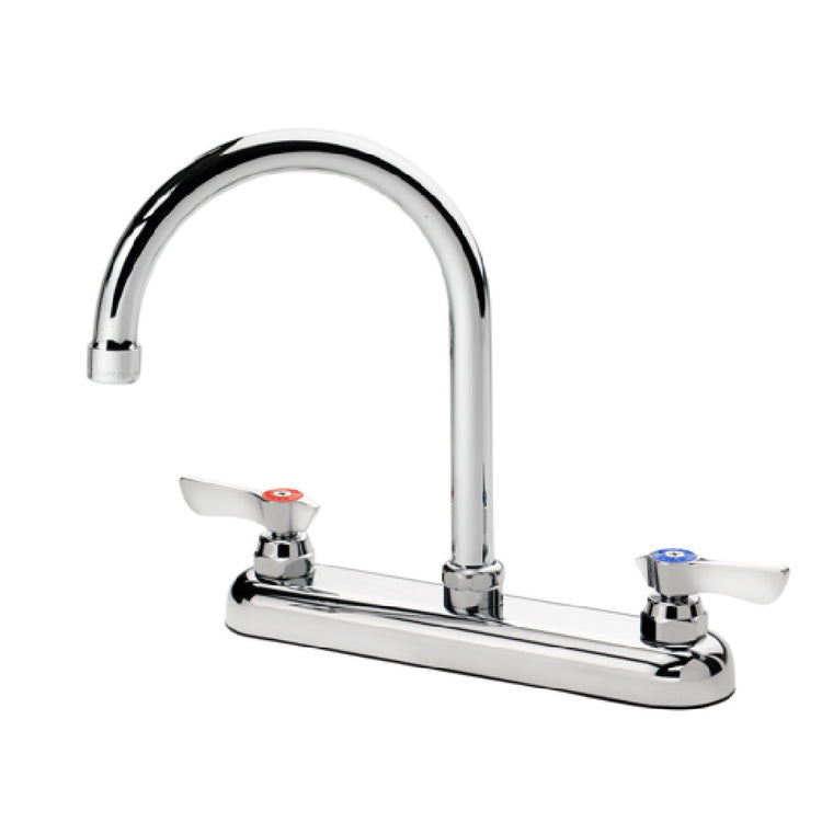 The Krowne 13-801L Krowne Silver Series Faucet Deck Mount 8" Centers is a meticulously engineered fixture designed to meet the rigorous demands of commercial kitchens and food service environments. Featuring an 8" center deck mount, this faucet ensures stability and reliable performance for high-traffic areas. The 6" gooseneck spout provides ample clearance and flexibility, making it ideal for filling large pots and containers, a crucial feature for busy culinary spaces. This faucet is equipped with a quarter-turn ceramic cartridge valve, renowned for its durability and smooth operation, ensuring long-lasting, drip-free performance. Importantly, the Krowne 13-801L is low lead compliant, aligning with stringent safety and health standards, making it a responsible choice for establishments prioritizing customer safety and regulatory compliance. This faucet is tailored for diverse industry segments, including restaurants, catering services, and institutional kitchens, where robust, efficient, and safe water dispensing solutions are essential. The combination of practical design and adherence to safety standards positions the Krowne 13-801L as a valuable addition to any professional kitchen setup, underscoring its commitment to quality and functionality within demanding operational contexts.