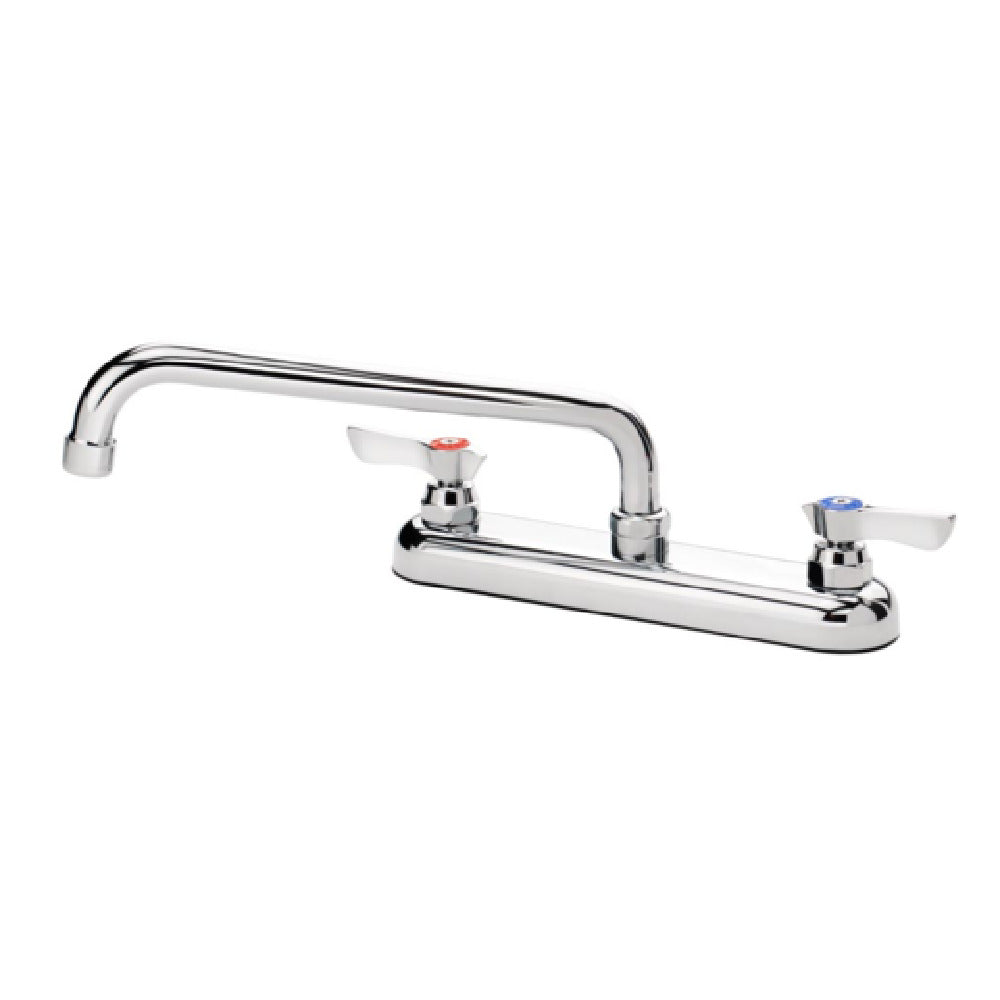 The Krowne 13-810L Krowne Silver Series Faucet Deck Mount 8" Centers is a cutting-edge plumbing fixture designed to meet the demanding standards of various commercial kitchens and washrooms. This faucet is engineered with 8-inch centers, providing a robust and versatile installation base that aligns with industry norms, ensuring compatibility with a wide range of sink setups. The 10-inch swing spout offers significant reach and maneuverability, making it ideal for tasks that require flexibility, such as filling large pots or washing extensive surfaces. One of its standout features is the quarter-turn ceramic cartridge valve, which affords precise water flow control and enhances the durability of the faucet by reducing wear and tear. This low lead compliant faucet adheres to strict safety standards, making it a safe choice for establishments mindful of health regulations. The Krowne 13-810L not only exemplifies superior functionality and resilience but also complements various market segments within the food service and hospitality industries. Whether in a busy commercial kitchen or a high-end restroom, this faucet's design facilitates both everyday efficiency and long-term reliability, underscoring its value as a high-performance solution in professional environments.