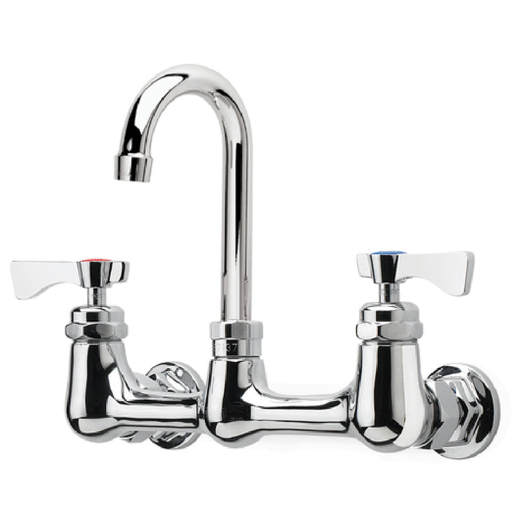 The Krowne 14-801L Krowne Royal Series Faucet is a splash-mounted unit designed with 8-inch centers, making it a versatile solution for commercial kitchens and food service establishments prioritizing efficiency and compliance. This faucet features a 6-inch gooseneck spout, providing ample clearance for washing and filling tasks. Equipped with a quarter-turn ceramic cartridge valve, it ensures smooth operation and durability, reducing the risk of leaks over time. The faucet's low lead compliance is crucial for establishments adhering to health and safety regulations, while its NSF certification underscores its adherence to public health standards. Additionally, the faucet includes internal check valves to prevent backflow and cross-contamination, a vital feature for maintaining hygiene in busy kitchen environments. The Krowne 14-801L is engineered to deliver reliability and functionality, catering to various segments within the food service industry, from high-volume restaurants to small-scale catering services. Its thoughtful design and robust construction make it a practical choice for those seeking a long-lasting and compliant solution for their kitchen needs.
