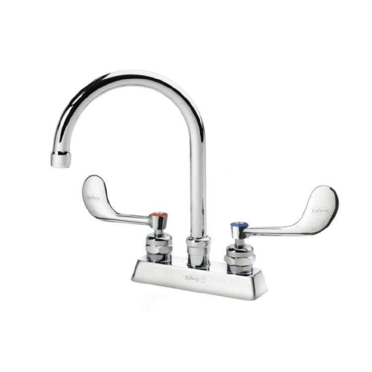 The Krowne 15-301L-W-E4 Royal Series 4" Deck Mount Faucet with 6" Wide Gooseneck Spout is a highly specialized plumbing fixture designed for optimal performance in various professional settings like commercial kitchens and laboratories. This faucet stands out with its 4-inch deck mount configuration, providing stability and ease of installation on countertops. The 6-inch wide gooseneck spout is engineered for ample clearance and versatile use, allowing users to fill large pots and containers effortlessly. Featuring vandal-resistant wristblade handles, it ensures durability and ease of operation, making it suitable for high-traffic environments. The faucet comes equipped with a 1.5 gallons per minute (GPM) aerator, optimizing water flow while conserving water, thus meeting efficiency standards. This combination of technical specifications and robust design elements makes the Krowne 15-301L-W-E4 an invaluable addition to spaces that require reliable and efficient water dispensing solutions, catering to markets that prioritize both functionality and durability in their plumbing fixtures.