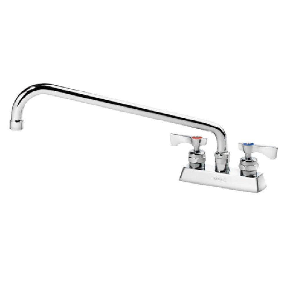 The Krowne 15-314L-L-F2 Royal Series 4" Deck Mount with 14" Swing Spout Lever Handles is a superior choice for commercial kitchens and professional food service settings. This deck mount faucet features a 14-inch swing spout, providing excellent reach and flexibility, crucial for varied kitchen tasks. Equipped with lever handles, it ensures ease of operation, allowing for precise control of water flow and temperature, which is essential in fast-paced environments. The faucet has a 1.5 GPM laminar outlet, promoting efficient water usage while maintaining a steady, non-splashing flow, which is particularly beneficial in maintaining cleanliness and reducing water waste. This product's unique value proposition lies in its blend of robustness and efficiency, making it suitable for high-volume kitchens, restaurants, and catering services. The Royal Series' design emphasizes durability and reliability, meeting the rigorous demands of the food service industry. Its advanced features cater to different market segments, including establishments focused on sustainability and cost-effective operations. With its industrial-grade construction, the Krowne 15-314L-L-F2 ensures long-lasting performance and contributes to a streamlined and hygienic working environment.