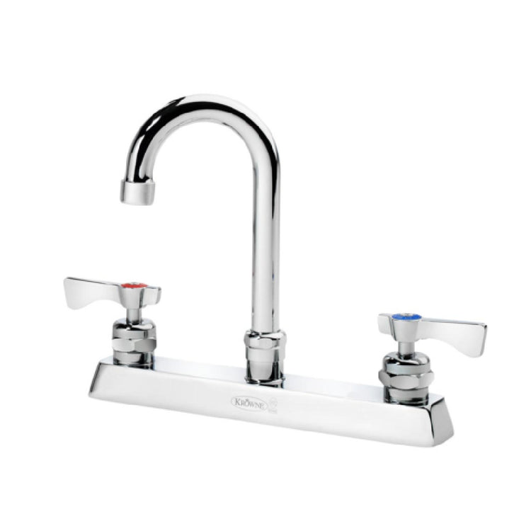 The Krowne 15-525L-W-E2 Royal Series 8" Deck Mount Faucet with 3-1/2" Wide Gooseneck Spout is an advanced fixture designed to meet the demands of diverse industry settings, from healthcare to hospitality. This faucet features a wide gooseneck spout measuring 3-1/2 inches, which facilitates ample water flow and accessibility. Engineered for durability and security, it includes vandal-resistant wristblade handles, which provide ease of use while enhancing the longevity of the product. The efficient design is highlighted by a .5 GPM (gallons per minute) aerator, ensuring water conservation without compromising performance. This makes the Krowne 15-525L-W-E2 an excellent choice for those looking to optimize water usage within their operations. The deck mount design allows for easy installation on a variety of surfaces, offering flexibility for different layout requirements. This faucet is particularly suited for environments where hygiene and ease of use are paramount, and its robust features make it a reliable component in any high-demand setting. Tailored for industries that require both functionality and resilience, the Krowne 15-525L-W-E2 stands out with its practical design and efficient water management capabilities.