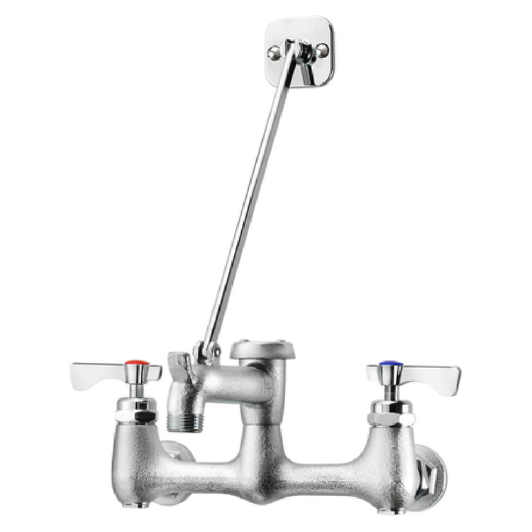 The Krowne 16-127 Krowne Royal Series Service Faucet is a highly versatile and robust fixture designed for commercial and industrial settings, featuring splash-mounted 8" centers for optimal stability and compatibility. Its 6-1/2" long heavy cast spout not only ensures durability but also features a bail hook and hose thread, making it ideal for diverse applications requiring secure hose connections. This faucet's unique bracket offers flexible installation options, allowing it to be mounted either above or below the sink, thus accommodating various spatial configurations. The inclusion of a vacuum breaker is a critical feature that prevents backflow, enhancing the faucet's safety and compliance with health standards. Crafted from rough brass, the faucet boasts both durability and an industrial aesthetic, while being low lead compliant, making it suitable for environments with strict safety regulations. Additionally, the faucet is NSF certified, affirming its adherence to public health standards. Internal check valves further ensure the prevention of cross-contamination, a crucial feature for maintaining hygiene in foodservice and healthcare industries. The Krowne 16-127 Krowne Royal Series Service Faucet is an exemplary choice for professionals seeking a reliable, high-quality faucet that meets rigorous operational demands.