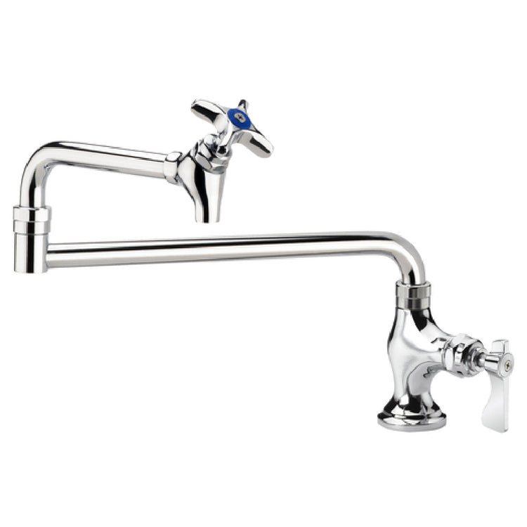 The Krowne 16-161L Krowne Royal Series Pot Filler Faucet stands out with its single-deck mount and a 12-inch jointed spout, making it a versatile tool for commercial kitchens and food service environments. It includes a shut-off valve, ensuring precise control over water flow, which is a critical feature for tasks requiring exact water measurements. The faucet is equipped with ceramic cartridge valves, enhancing its durability and offering smooth operation over time. Included in the package is a deck mounting kit, facilitating straightforward installation. The faucet's design is low lead compliant, aligning with health and safety regulations, a significant consideration for commercial and institutional kitchens. Additionally, the internal check valves prevent backflow and cross-contamination, safeguarding water safety and maintaining hygiene standards. The Krowne 16-161L's robust features and compliance make it an ideal choice for diverse segment markets, such as restaurants, cafes, and catering services, where reliability and compliance are paramount. This faucet marries efficiency with safety, providing a valuable solution for those in the food and hospitality industries looking for dependable kitchen fixtures.