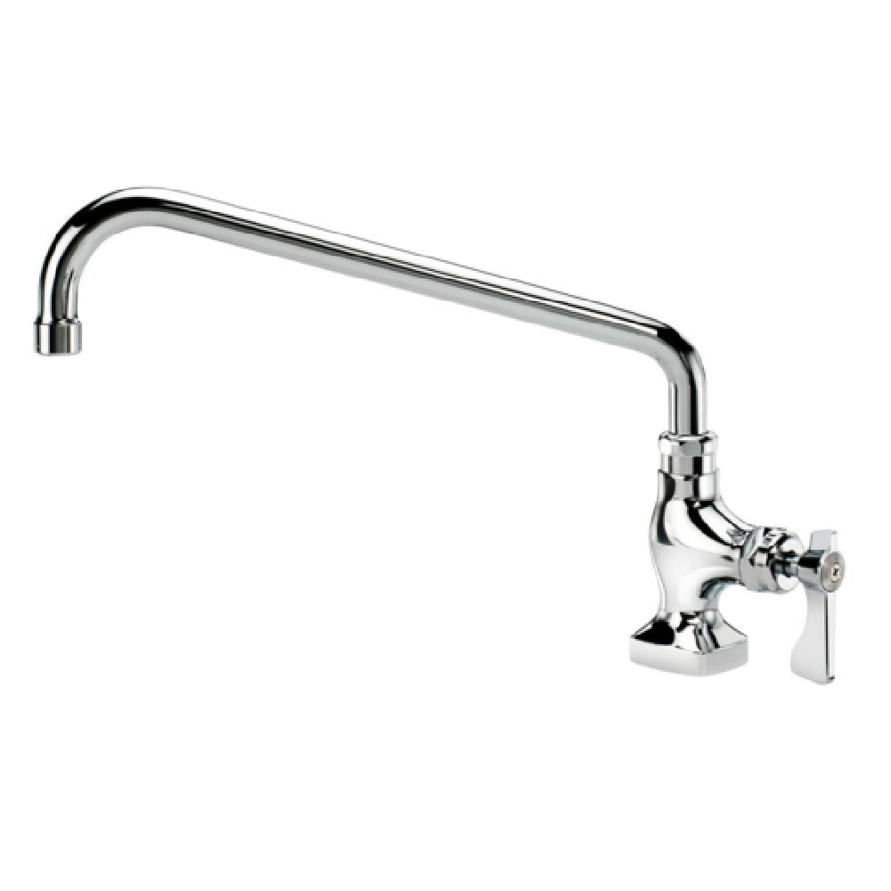 The Krowne 16-201L Krowne Royal Series Single Pantry Faucet is a highly functional and adaptable fixture designed for various commercial settings. This deck-mounted faucet features a 12-inch swing spout, providing versatility and efficiency in water dispensing. Notably, it includes a 1/2-inch NPS male inlet, ensuring compatibility with a range of plumbing setups. The internal check valves are a standout feature, effectively preventing backflow and cross-contamination, which is crucial for maintaining hygiene standards in professional environments. The faucet boasts a polished chrome finish, adding a sleek and modern look while ensuring durability and resistance to corrosion. It is NSF certified, confirming its adherence to strict public health standards, and cCSAus approved, indicating its compliance with North American safety regulations. Additionally, this product is ADA compliant, making it accessible and easy to use for individuals with disabilities. The Krowne 16-201L is a versatile and reliable choice for restaurants, hospitality venues, and other commercial kitchens requiring a high-quality, safe, and efficient water dispensing solution.
