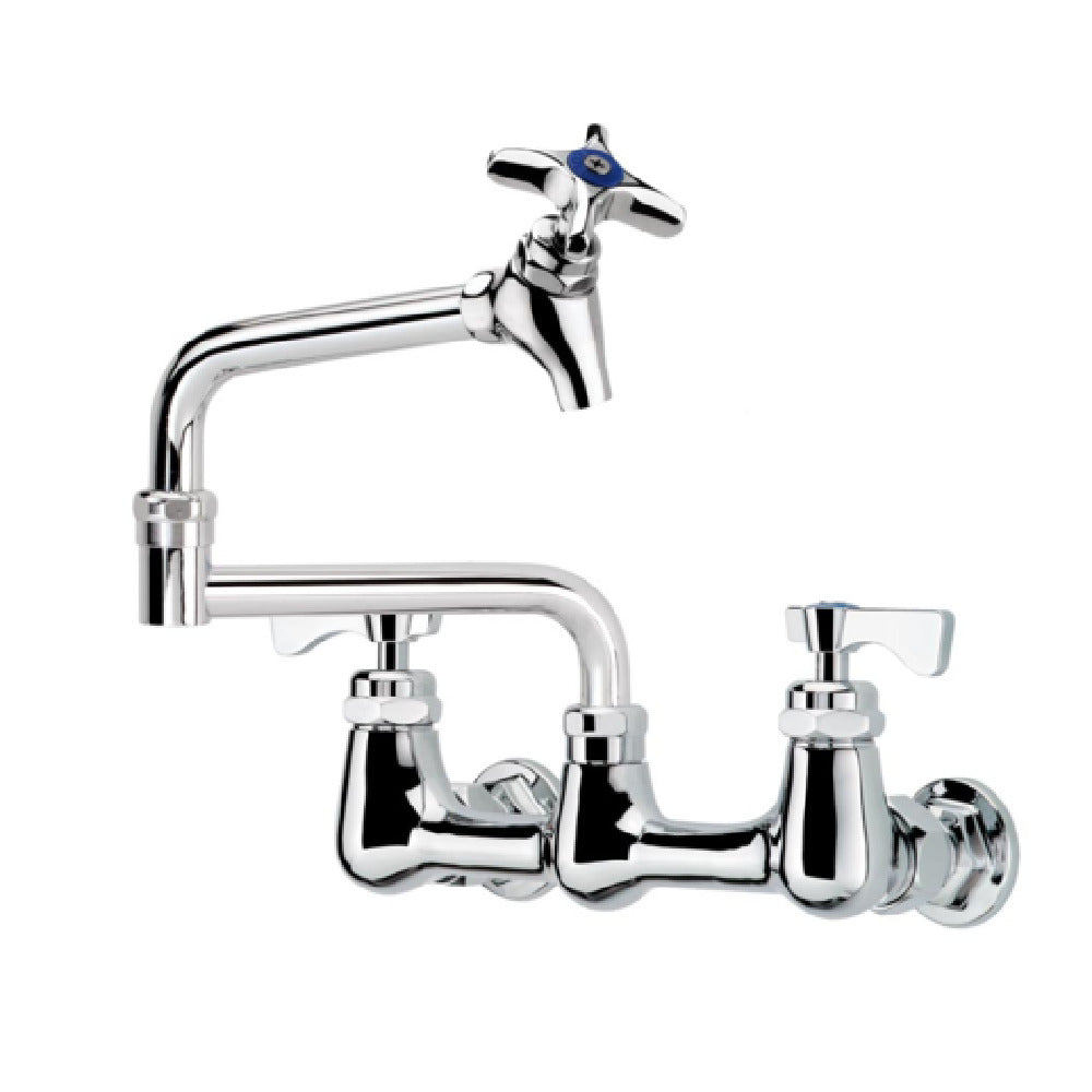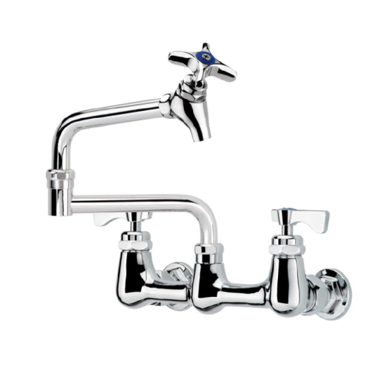 The Krowne 16-251L Krowne Royal Series Pot Filler Faucet - wall mount - 8" centers, is engineered to meet the multifaceted needs of both commercial and residential kitchen environments. Featuring a 12" jointed spout with a convenient shut-off valve, this faucet ensures precise control over water flow, essential for filling large pots with ease. Its ceramic cartridge valves enhance durability and ensure a long lifespan, minimizing maintenance concerns. The inclusion of a wall mounting kit simplifies installation, providing a complete solution for various kitchen setups. This faucet is low lead compliant, aligning with modern health and safety standards to ensure safe water quality. Additionally, the internal check valves are designed to prevent backflow and cross-contamination, adding an extra layer of protection for culinary operations. This technical sophistication makes the Krowne 16-251L indispensable for culinary professionals requiring reliability and efficiency, as well as for home cooks seeking the convenience and functionality of professional-grade equipment. Its versatile design makes it a practical choice for various market segments, from bustling restaurant kitchens to premium home cooking spaces, where safety, compliance, and performance are paramount.