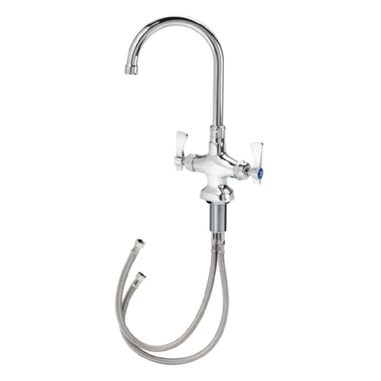 The Krowne 16-301L Krowne Royal Series Double Pantry Faucet Deck Mount Gooseneck Spout is a premium plumbing fixture engineered for versatility and performance in various commercial settings. It features a deck-mounted design, ideal for professional kitchens and food service establishments requiring reliable and efficient water access. The gooseneck spout provides ample clearance, enabling easy filling of large pots and containers while ensuring precise water delivery. This faucet is low lead compliant, aligning with stringent safety standards to ensure safe, potable water use across diverse industries. Additionally, the inclusion of internal check valves is a pivotal design element, effectively preventing backflow and cross-contamination, which is crucial for maintaining hygiene and water quality in high-demand environments. The Krowne 16-301L faucet is meticulously crafted to meet the specific needs of commercial kitchens, catering businesses, and hospitality venues, providing a combination of durability, compliance, and practicality. Its construction caters to the rigorous demands of professional usage, presenting a reliable solution for those seeking a faucet that excels in both function and safety. This product holds a unique position in the market, effectively supporting industry professionals with its robust and compliant design tailored to diverse operational requirements.