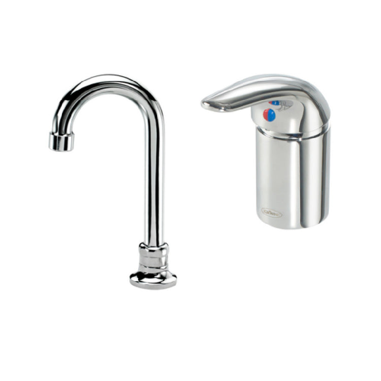 The Krowne 16-330L Krowne Royal Series Faucet is a sophisticated deck-mount, single-hole faucet designed for efficiency and reliability. This faucet features a single lever with a color-coded index, allowing for precise control and ease of use. It includes a remote valve connected to a 3 1/2" W gooseneck remote spout, catering to a variety of applications within the industry. The faucet is equipped with a 1.8GPM aerator, providing an optimal flow rate for water conservation without compromising performance. At the heart of its functionality is a ceramic cartridge valve with an integrated temperature limit stop, ensuring durability and safety during operation. The solid construction of chrome-plated brass not only enhances its aesthetic appeal but also guarantees longevity. Preinstalled water lines with 3/8" compression female inlets ensure a straightforward installation process, reducing downtime and labor costs. The Krowne 16-330L faucet meets ADA and NSF standards, highlighting its compliance with accessibility and safety regulations. This product is ideal for use in commercial kitchens, healthcare facilities, and public restrooms, where reliability and hygiene are paramount. Its blend of technical features and robust construction make it an invaluable addition to any professional setting.
