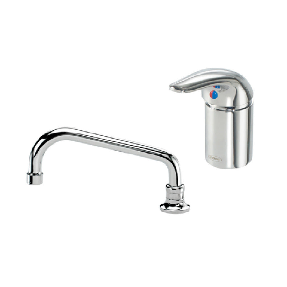 The Krowne 16-332L Krowne Royal Series Faucet is a deck-mount, single-hole fixture designed for both durability and efficiency, making it suitable for a variety of commercial settings. It features a single lever with a color-coded index, enhancing user convenience through clear temperature control. This faucet includes a remote valve with an 8-inch remote spout, offering flexible installation options across different environments. The inclusion of a 1.8GPM aerator ensures water conservation without compromising performance. Its ceramic cartridge valve is equipped with a built-in temperature limit stop, providing an added safety measure against excessively hot water. Constructed with a solid chrome-plated brass body, the faucet promises long-lasting durability and a sleek aesthetic. It comes with preinstalled water lines featuring 3/8" compression female inlets, facilitating straightforward installation. This product is ADA compliant and NSF certified, ensuring it meets high standards of accessibility and public health safety. The Krowne 16-332L is a valuable choice for establishments prioritizing functionality, safety, and reliability in their fixtures, catering well to diverse market segments within the industry.