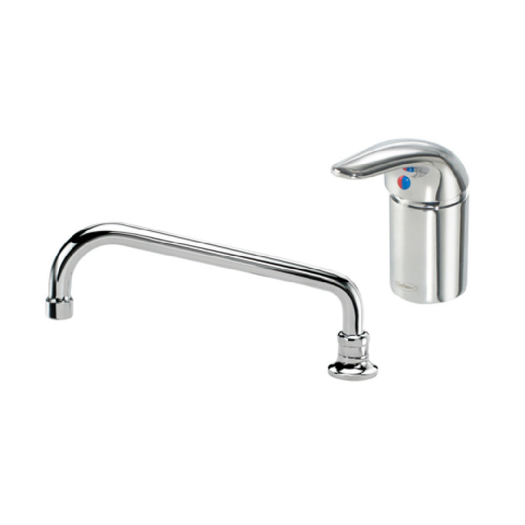 The Krowne 16-333L Krowne Royal Series Faucet Deck-mount Single Hole is a highly efficient and versatile plumbing fixture designed for various professional settings. This faucet is deck-mounted with a single-hole installation, making it suitable for spaces with limited mounting options. It features a single lever with a color-coded index, ensuring ease of use and quick temperature adjustments. The faucet is equipped with a 10-inch remote spout, providing extended reach and flexibility during operation. Its 1.8GPM aerator optimizes water flow while maintaining efficiency. The ceramic cartridge valve includes a built-in temperature limit stop, enhancing safety and preventing scalding. Crafted with a solid chrome-plated brass body, the faucet offers durability and a sleek aesthetic. Preinstalled water lines with 3/8-inch compression female inlets facilitate straightforward installation. The Krowne 16-333L is compliant with ADA standards, ensuring accessibility for all users. Additionally, it is NSF certified, confirming its adherence to public health and safety requirements. This faucet is an excellent choice for commercial kitchens, healthcare facilities, and other environments where reliability and performance are paramount.