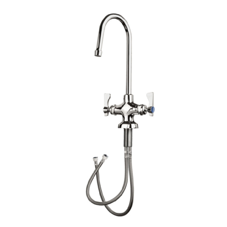 The Krowne 16-450L Krowne Royal Series Lavatory Faucet is a meticulously engineered fixture designed for precision and reliability in commercial environments. This single-deck mount faucet features a rigid gooseneck spout, delivering robust and consistent water flow suitable for a variety of applications, making it a versatile choice for restaurants, healthcare facilities, and hospitality businesses. The faucet is equipped with 1/4 turn ceramic cartridge valves, ensuring smooth operation and long-lasting performance. It comes with two 3/8" stainless steel supply hoses, which enhance durability and ease of installation. Constructed from high-quality brass, the faucet meets low lead compliance standards, making it safe for environments where safety and health are paramount. The inclusion of internal check valves effectively prevents backflow and cross contamination, contributing to a hygienic setup. This product is NSF certified, which ensures it adheres to strict public health standards. The Krowne 16-450L's combination of technological advancements and rigorous compliance makes it a critical component for businesses that prioritize efficiency and safety in their operations. Its robust construction and thoughtful design make it a valuable addition to any commercial lavatory setting.
