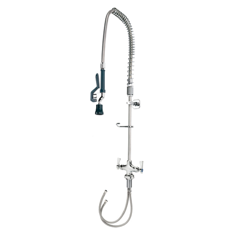 The Krowne 17-202WL Krowne Royal Series Pre-Rinse Assembly Single Hole Deck Mount is a meticulously designed unit that caters to various market segments within the commercial kitchen and restaurant industry. This assembly features a double pantry system and a spring action flexible gooseneck, ensuring robust utility and ease of use for high-demand environments. Its 38-inch high stainless steel hose, with a 15-inch overhang, supports a 1.2 GPM spray head, making it a versatile tool for efficient cleaning operations. The assembly is equipped with built-in check valves to prevent backflow and cross-contamination, adhering to stringent hygiene standards. Its chrome-plated brass base adds durability and resistance to wear, supplemented by its low lead compliance, making it a safe choice for health-conscious establishments. Additionally, the unit includes a wall bracket and a mounting kit for streamlined installation. This pre-rinse assembly is interchangeable with most brands, enhancing its adaptability in diverse settings. Furthermore, it is NSF certified, underscoring its compliance with public health and safety standards. The Krowne 17-202WL is delivered pre-assembled, offering convenience and efficiency right out of the box for professional kitchens seeking reliable and durable equipment.