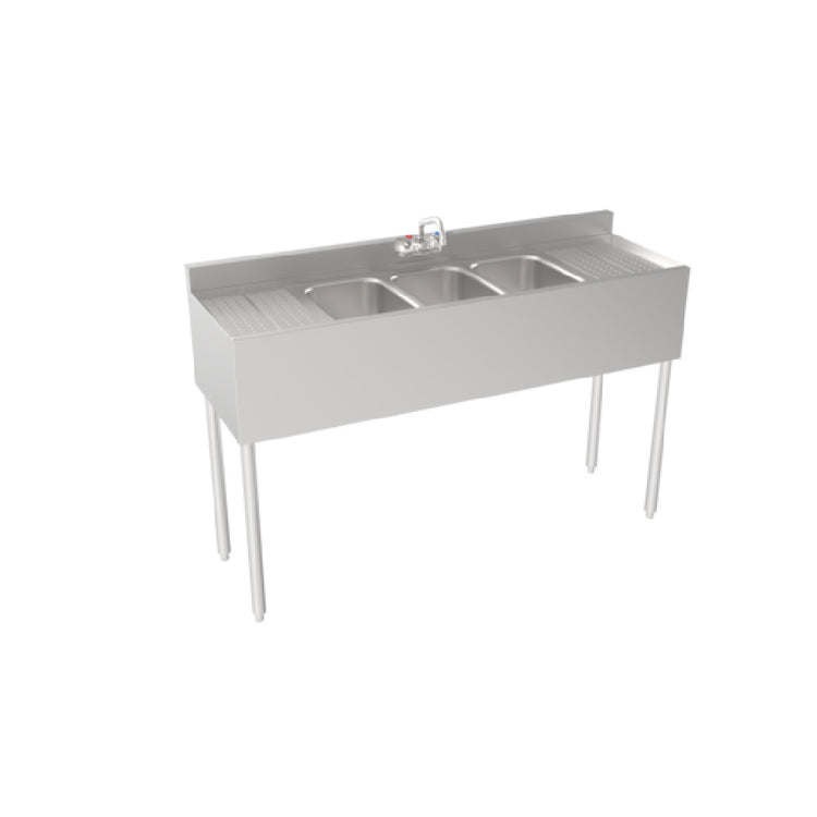 Krowne, 18-53C, Silver Series Three Compartment Sink with Left and Right Drainboards, 60" W x 18.5" D, (3) 10"D x 14"W x 10"H bowl size, (3) 1-1/2" drains, 3” H backsplash with wall mount faucet included with quarter turn ceramic valves, Durable stainless steel construction, 1-5/8” tubular legs with gray plastic bullet feet, Pre-drilled rivnuts for easy attachment in the field, NSF